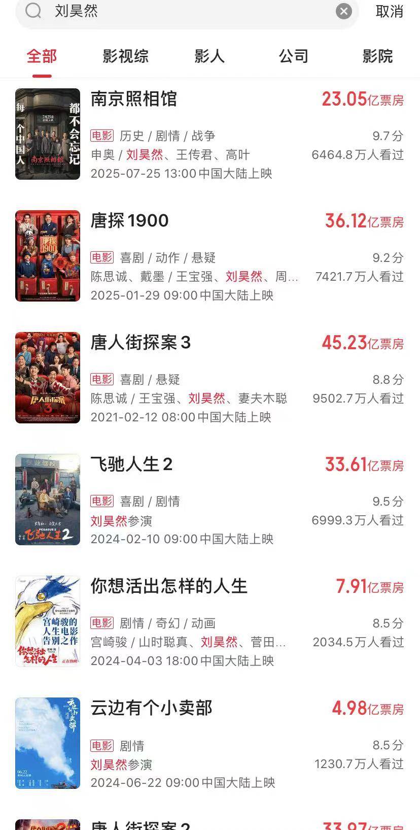 刘昊然主演的《南京照相馆》票房已经23亿,是2025年暑期档票房最高的电影。还有《唐探》系列的大卖,《飞驰人生2》的票房也很高,其实严格意义上来说,这部电影刘昊然的戏份很少。